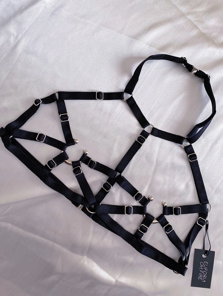 Arnes confeccionado con elasticos regulables y dijes a la altura de los pezones.