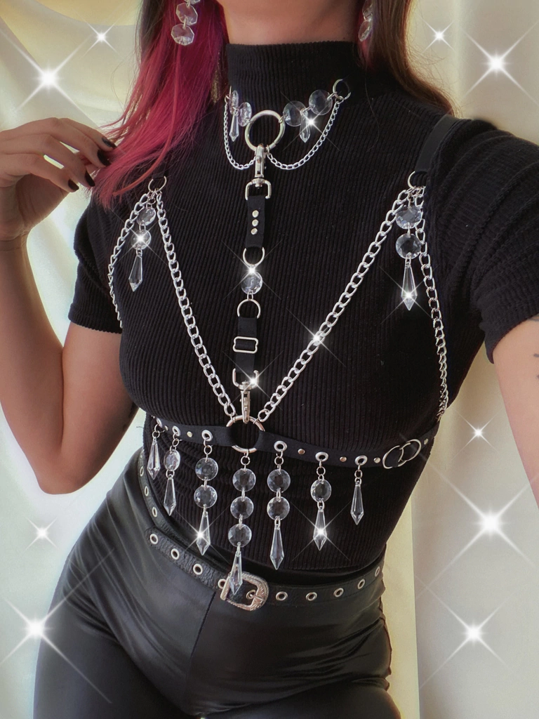 Arnes con feccionado con elasticos regulables, detalles de ojales, tachas, gemas colgantes, cadenas, mosquetones para desmontar centro.