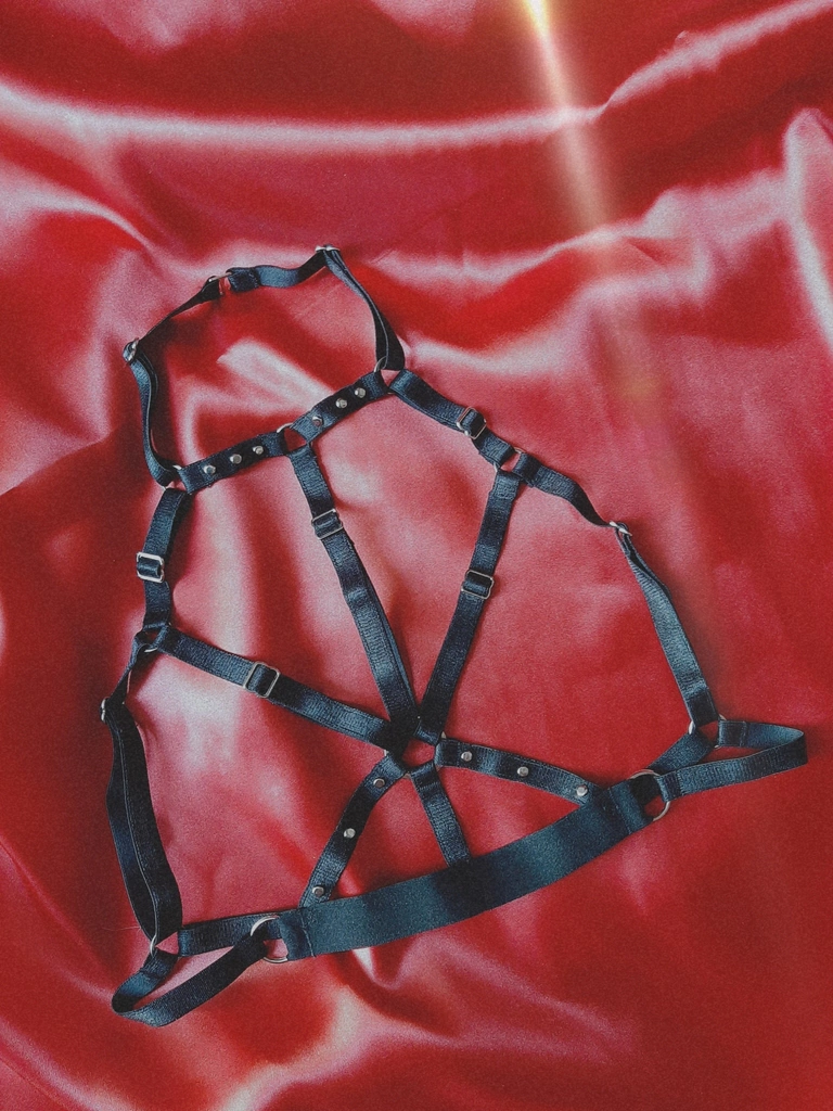 Arnes superior de elasticos regulables en todas sus tiras, lo que permite adaptarse a cada cuerpo. Detalles de tachitas.