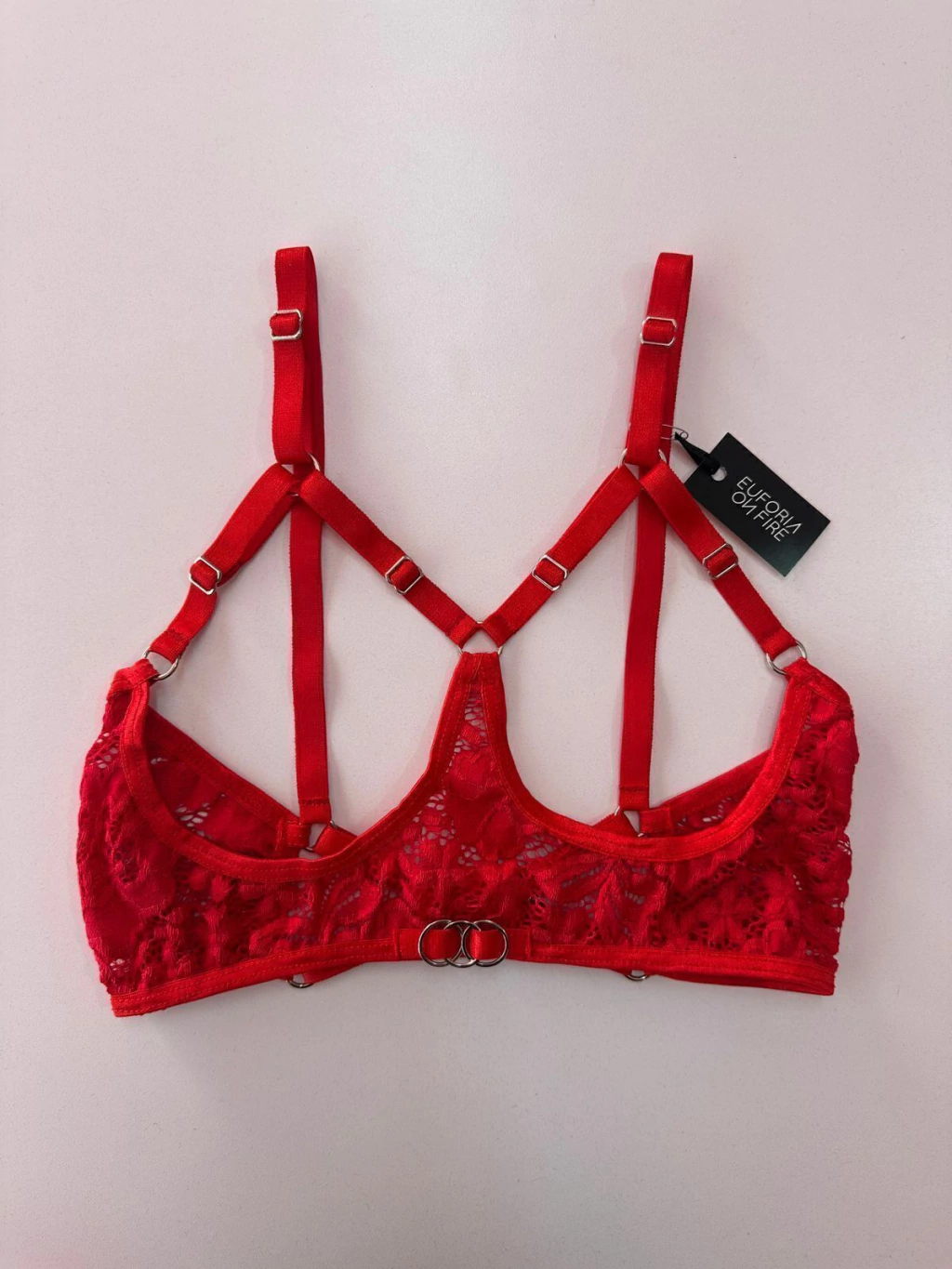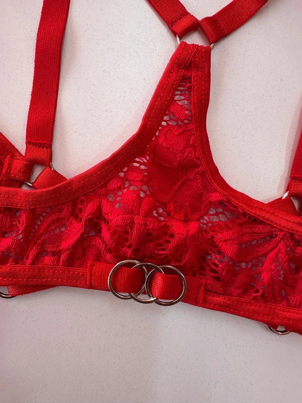 Corpiño confeccionado con encaje rojo, detalle de argollas entrelasadas, elasticos regulables. La espalda tambien es regulable.