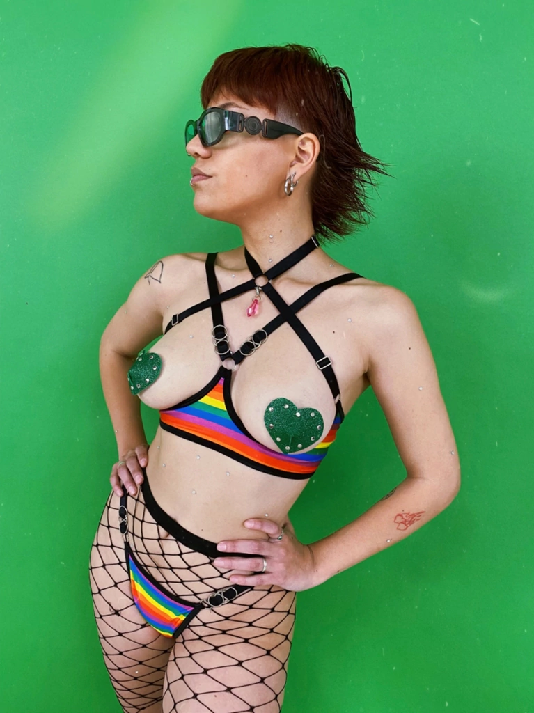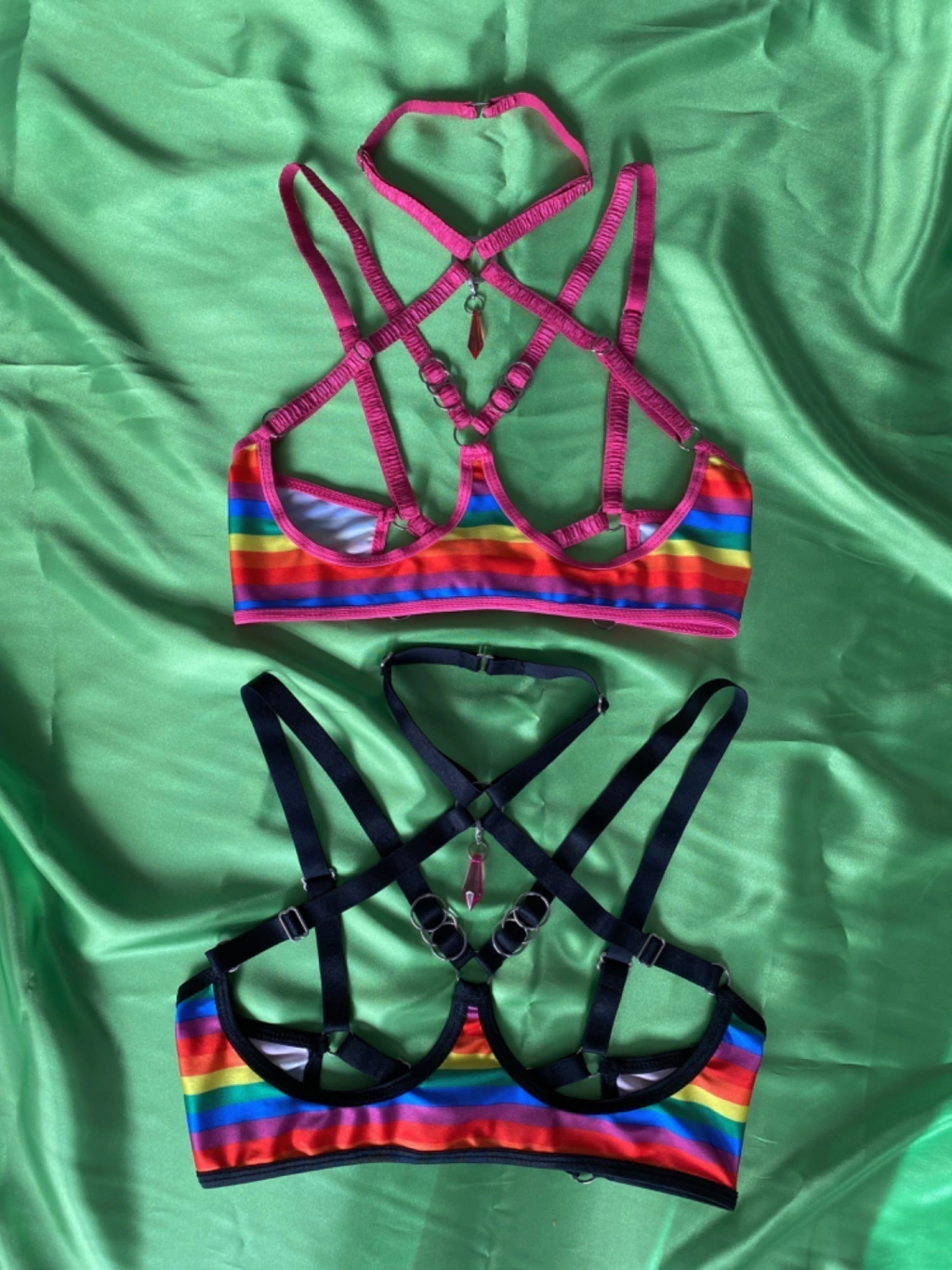 Corpiño confeccionado con lycra, elasticos regulables y detalles de argollas. La espalda es regulable.