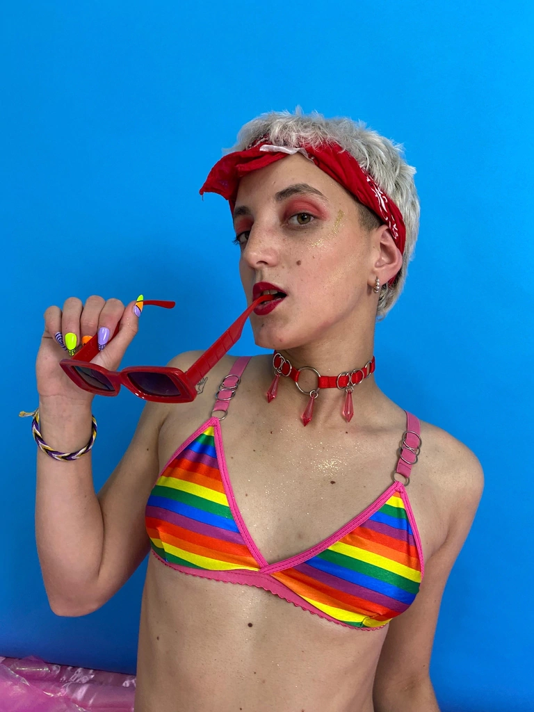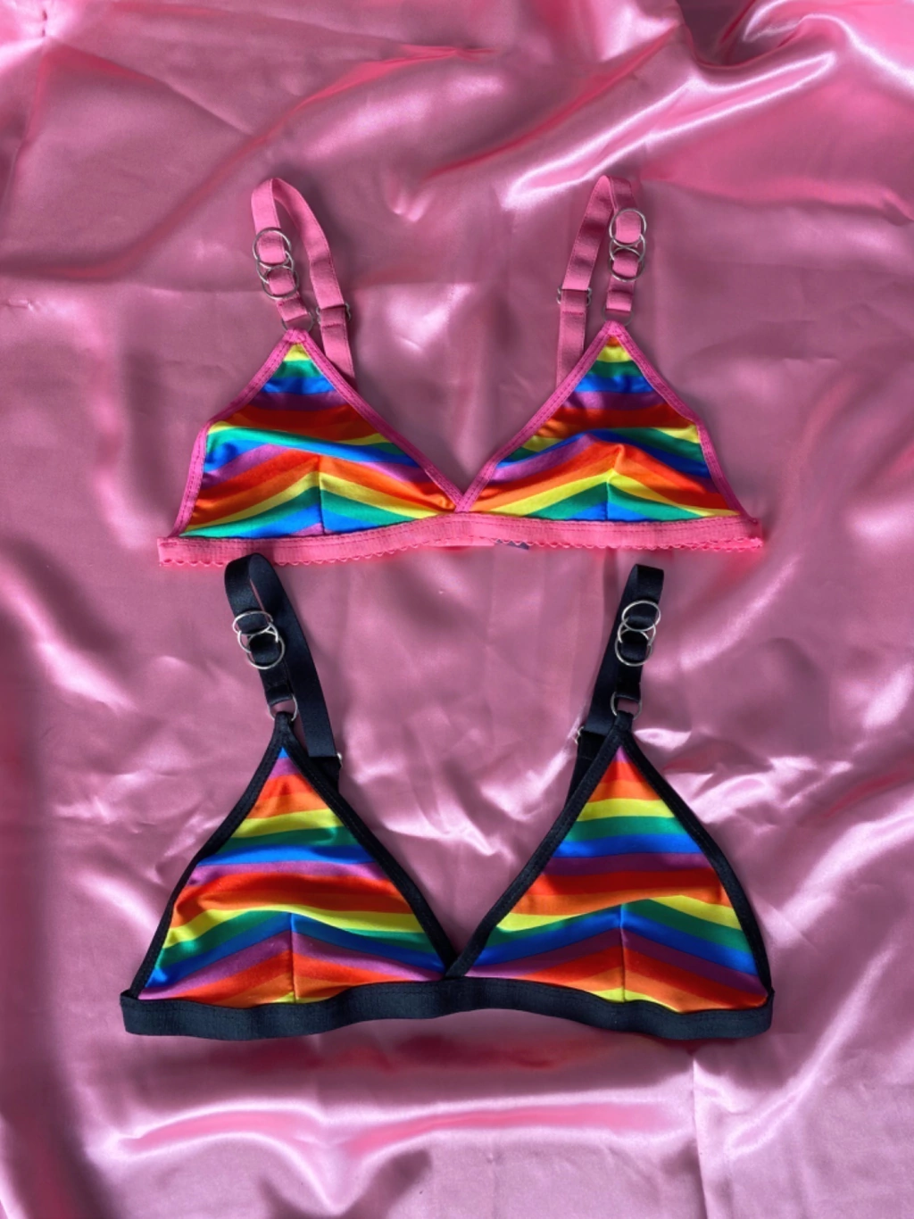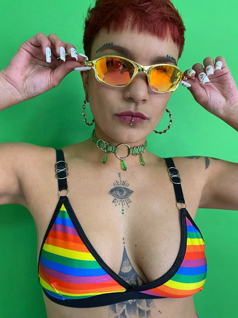 Corpiño confeccionado con lycra. Breteles regulables y detalles de argollas.